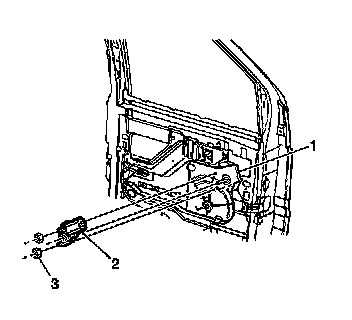 2. Install the nuts (3) in order to retain the power window motor (2) to the front door module (1).