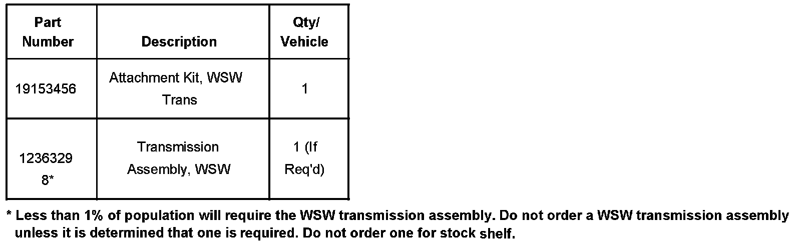 * Less than 1% of population will require the WSW transmission assembly. Do not order a WSW transmission assembly unless it is determined that one is required. Do not order one for stock shelf.
