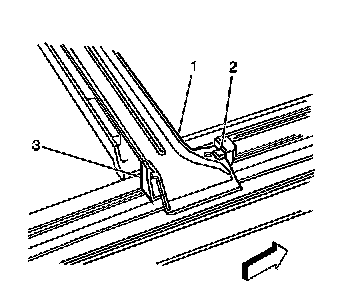 2. Push on the drain channel (1) until it locks into place by the retainer (3). Do the same for the other side.