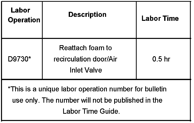 The adhesive foam used on the air recirculation door (air inlet valve) may not be properly secured, causing some of the foam to contact other HVAC components. The foam could potentially come in contact with the blower motor fan and/or the foam may stick to the inner HVAC case walls, causing the door to stick or hang up.