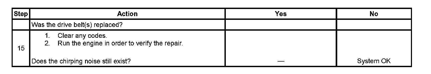 3. The noise may be an internal engine noise. Remove the drive belt(s) and operate the engine for a few seconds, this will verify if the chirping noise is related to the drive belt(s) or not. With the drive belt(s) removed the water pump will not operate and the engine may overheat. Also diagnostic trouble codes (DTC's) may set when the engine is operated with the drive belt(s) removed.