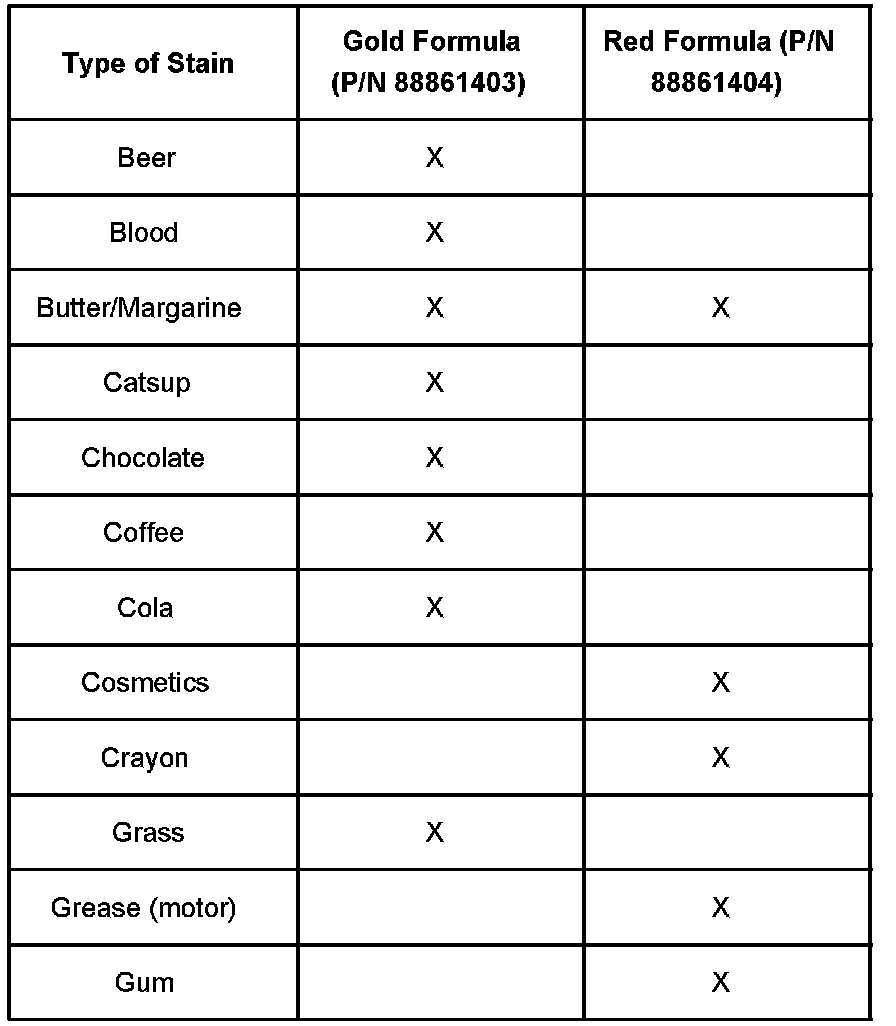 When cleaning upholstery and carpet stains ONLY, the cleaning chart shown will help you determine which cleaner/formula works best on a particular stain. The chart lists many of the common stains. Some complex stains may require the application of both stain removers, one after the other, to remove both food-based oils and synthetic oils.