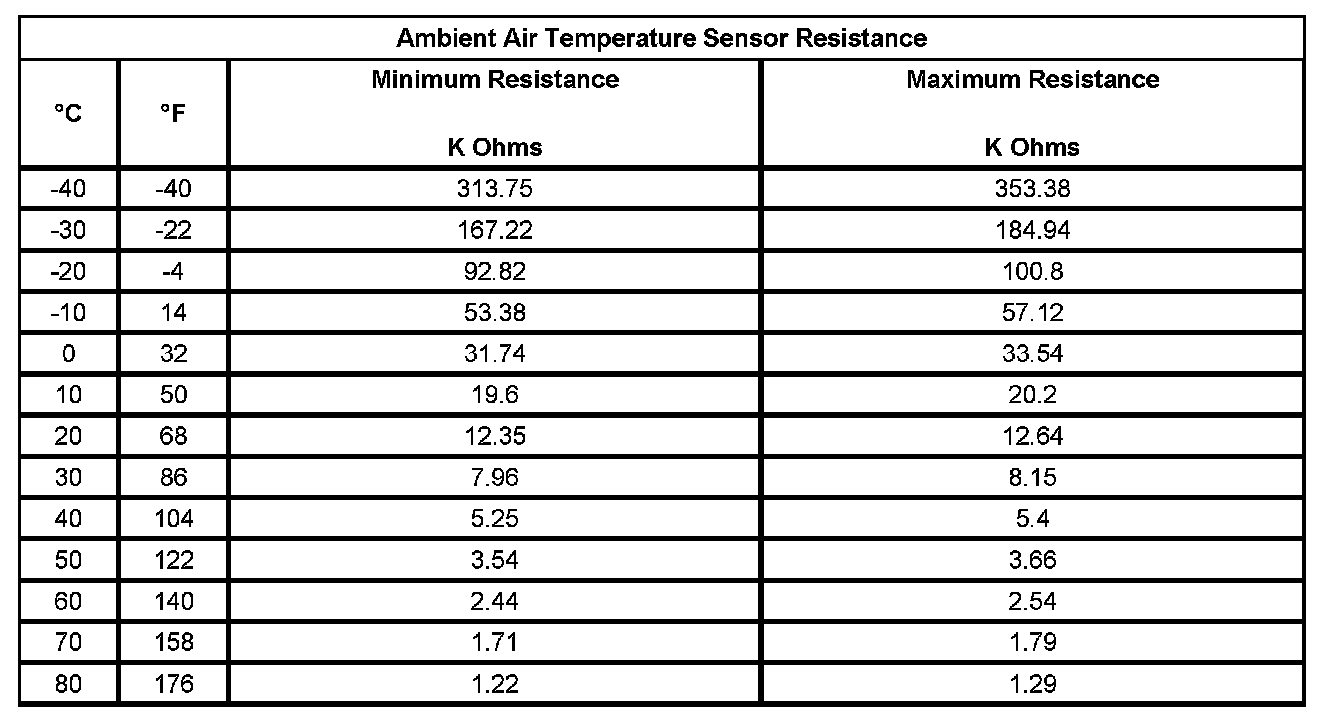 The instrument panel cluster (IPC) applies 5 volts to the ambient air temperature sensor. The ambient air temperature sensor is a thermistor which varies in resistance as the temperature changes. As the resistance of the ambient air temperature sensor increases, the IPC senses a larger voltage drop across the sensor, indicating a lower temperature. As the resistance of the ambient air temperature sensor decreases, the IPC senses a smaller voltage drop across the sensor, indicating a higher temperature.