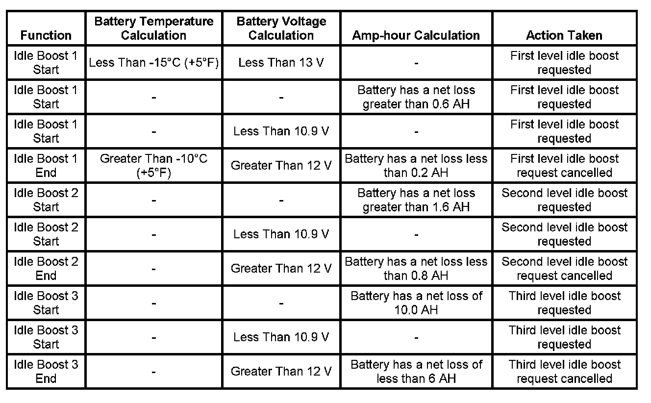 The idle boost operation is a means of improving generator performance during a low voltage or low battery SOC condition.