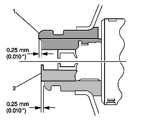 3. Ensure that the power steering pump pulley is flush against the power steering pump shaft (2), with an allowable variance of 0.25 mm (0.010 in).