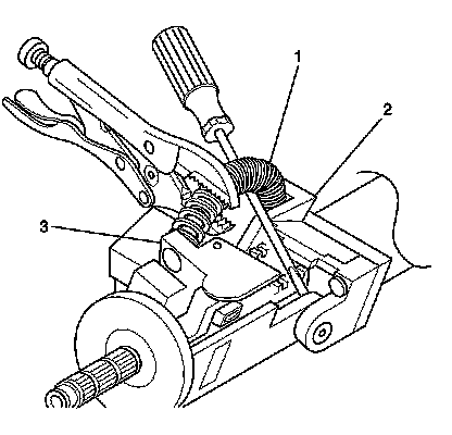 5. Remove the tilt spring (1) from the steering column support assembly (2) and from the steering column tilt head assembly (3) by using the following procedure: