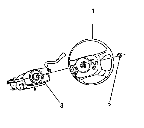 1. With the marked relationship references in line, install the steering wheel (1) onto the column (3).