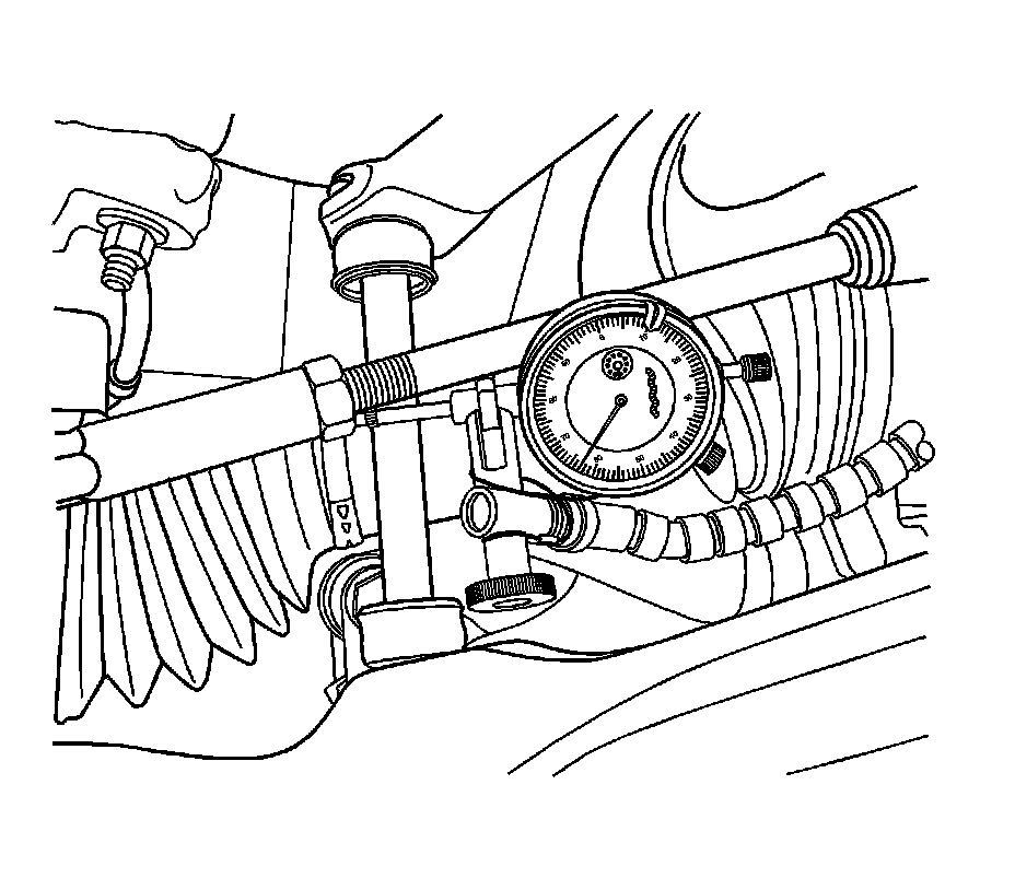 2. Install a dial indicator between the outer tie rod and the steering knuckle as shown and push inward to remove the lash slowly with one hand.