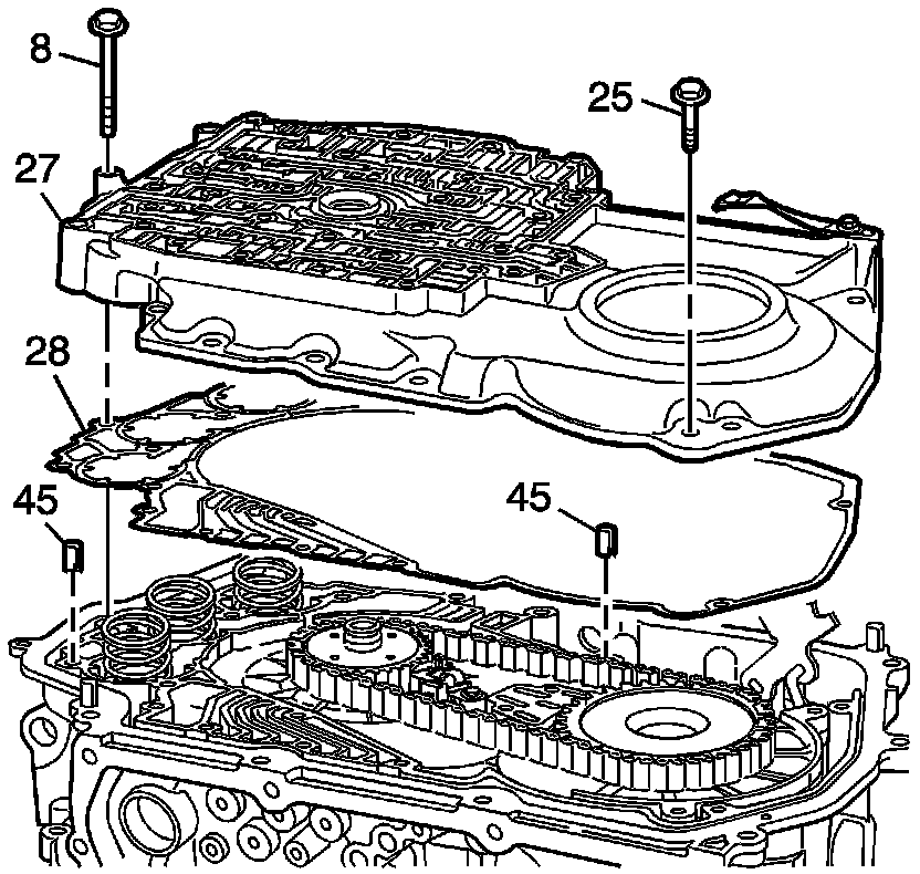 Notice: Pry on the channel plate near locating dowel pins (45) to prevent damage to sealing surfaces.