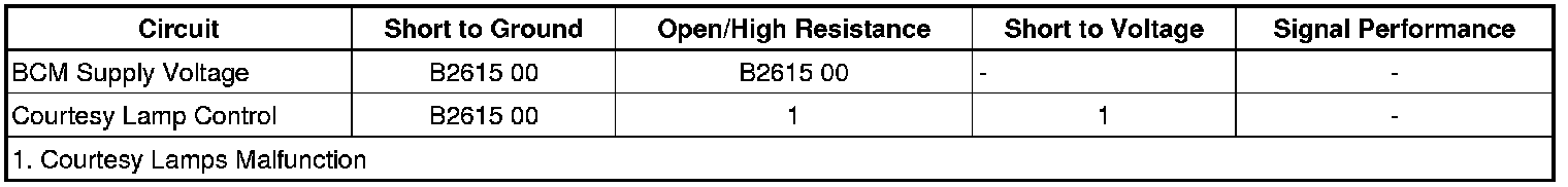 The BCM detects a short to ground on the courtesy lamp supply voltage circuit.