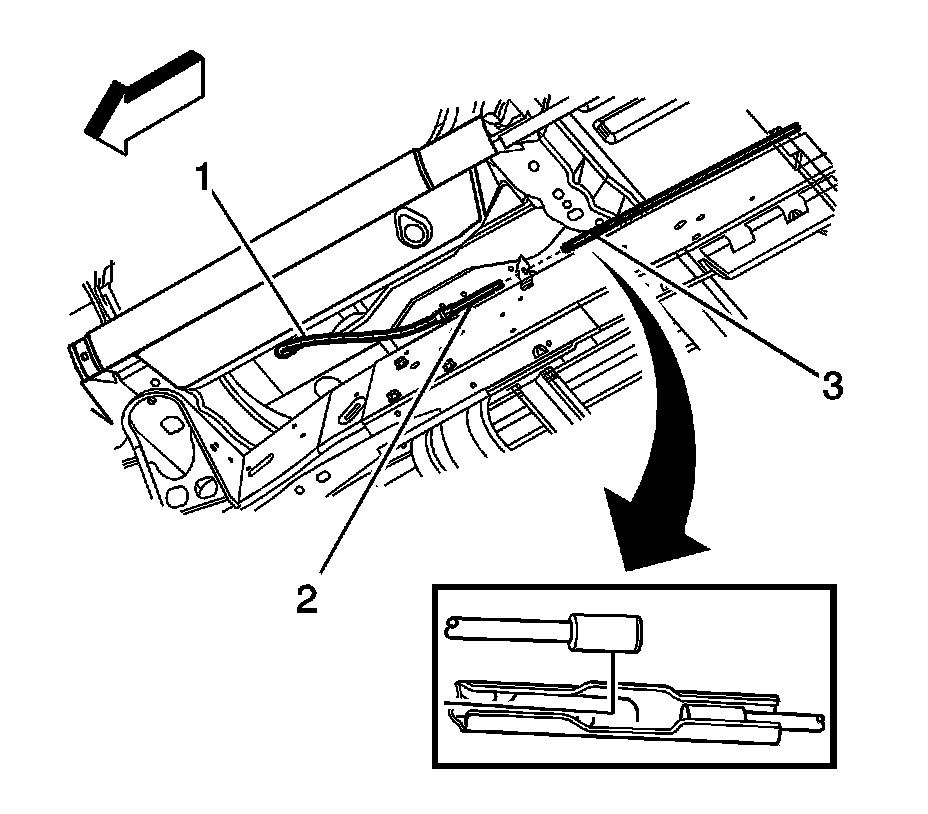 4. Route the cable in through the floor pan and engage the grommet (1).