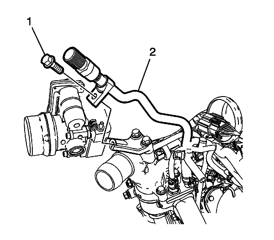 7. Remove the fuel pressure valve bolt (1) and reposition the fuel line (2).