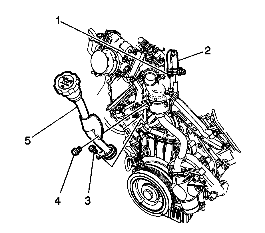 10. Remove the oil fill tube bolt (3); the oil fill tube retainer bracket bolt (4) and the oil fill tube (5).