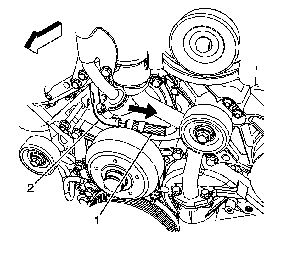 5. Reposition the hose clamp and move the turbocharger coolant return hose (1) away from the turbocharger coolant return pipe (2).