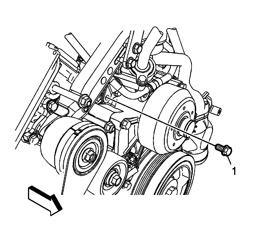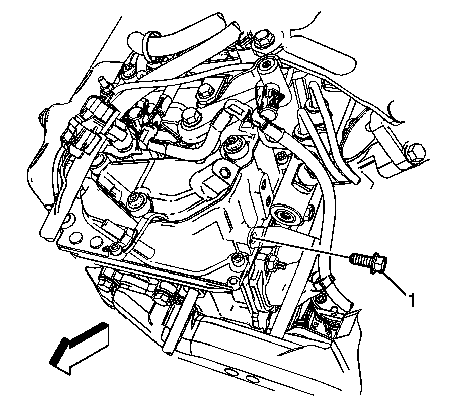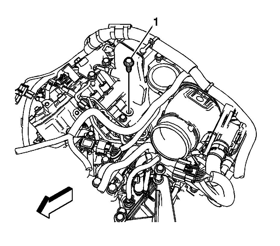 7. Remove the turbocharger coolant return pipe retainer bolt (1) attached to the right front valve cover.