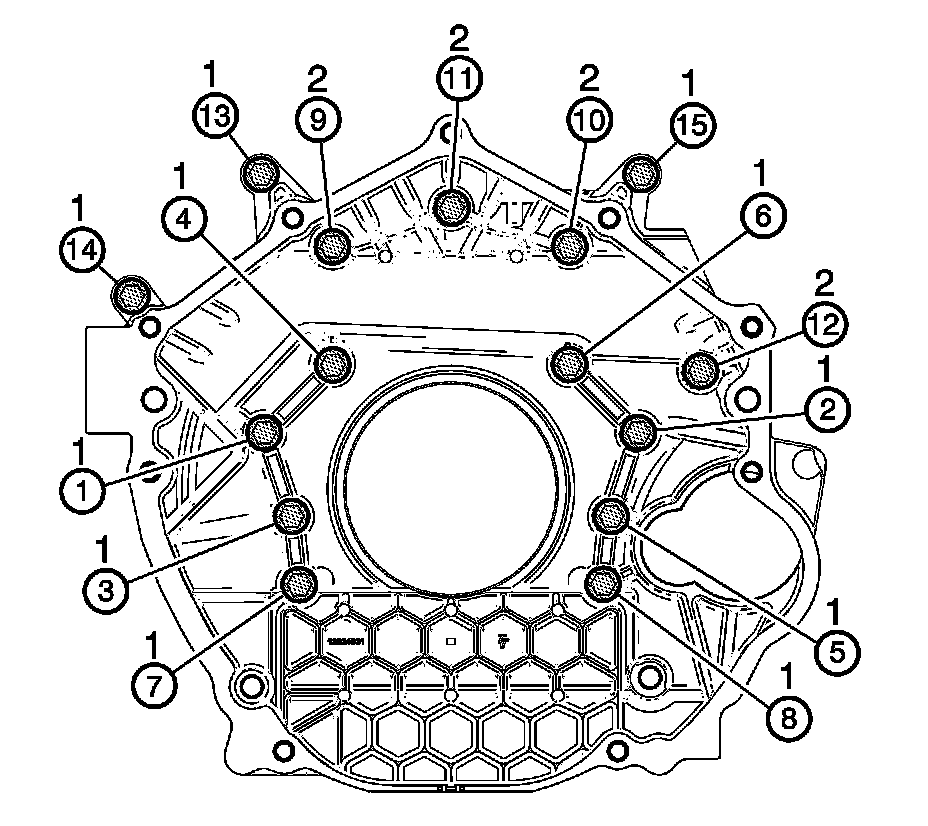 6. Tighten the flywheel housing bolts (1) and (2) in sequence to 95 Nm (70 lb ft).