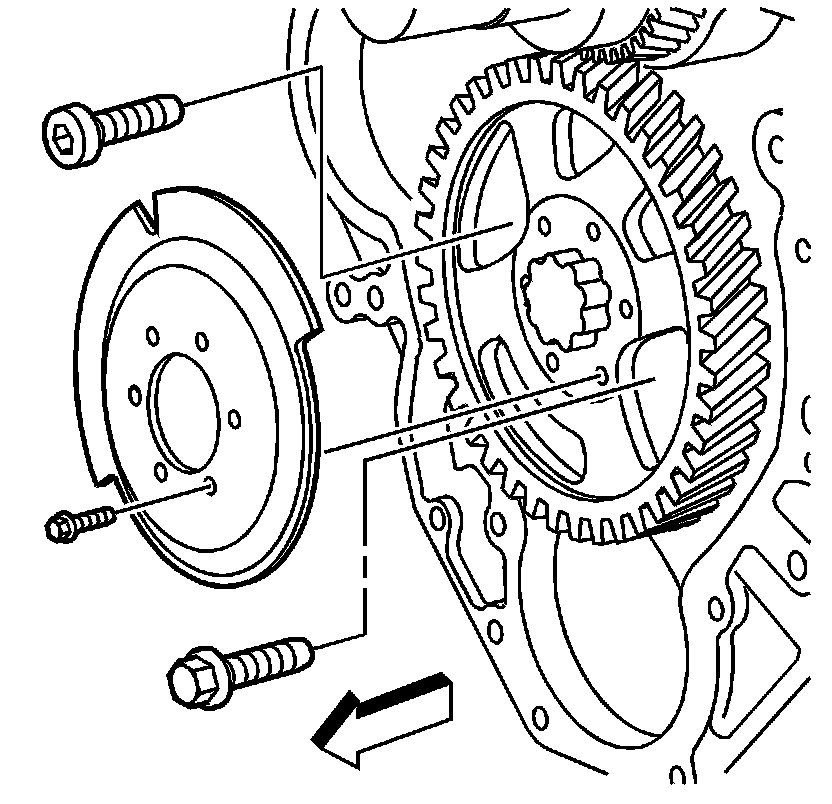 7. Remove the camshaft thrust plate bolts through the holes in the camshaft gear.