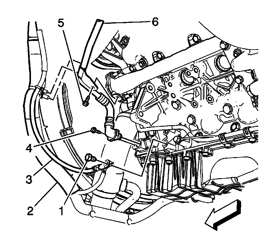 5. Install the oil separator drain pipe (6) with bolt (4) and the retainer bracket bolt (5).
