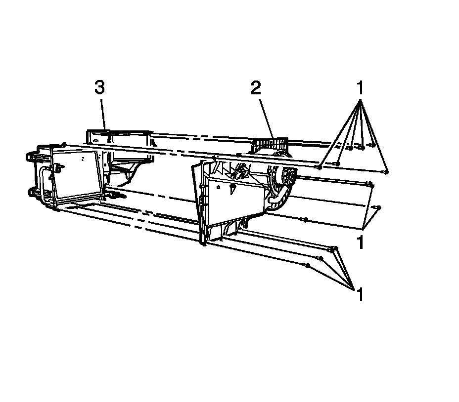 12. Remove the evaporator and blower module assembly front cover (2) from the evaporator case (3).