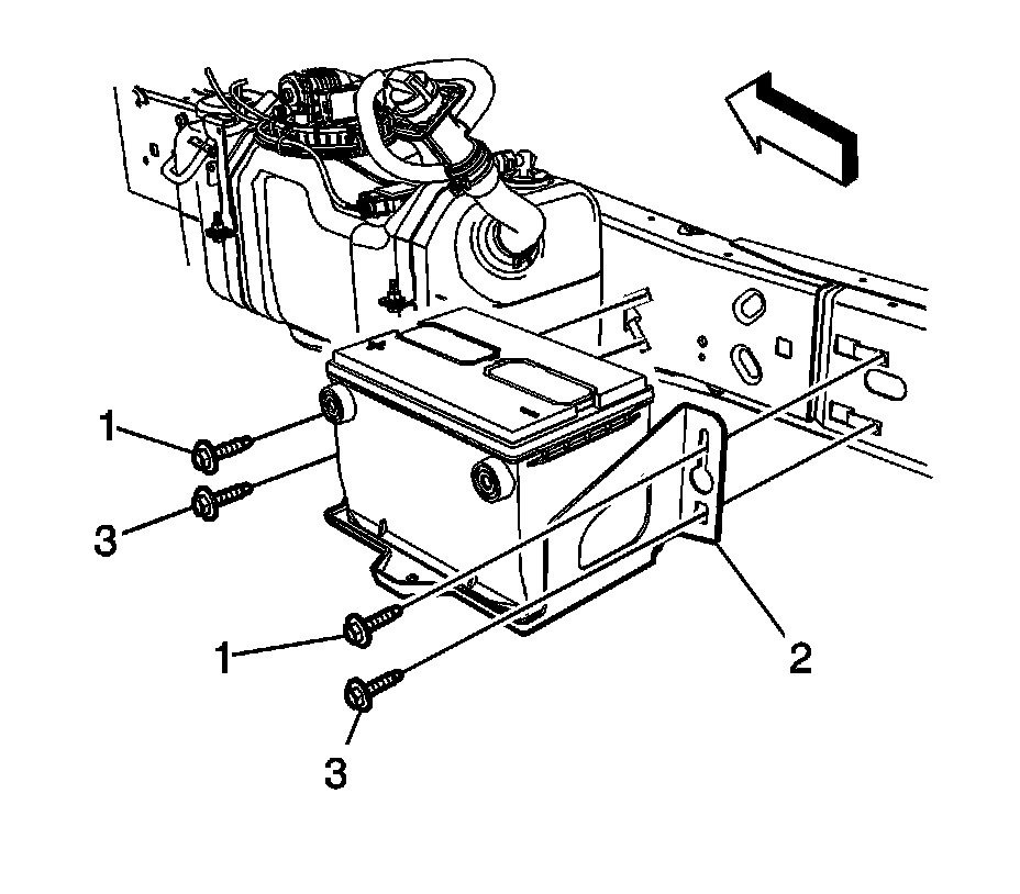 4. Install the lower battery tray bolts (3) and tighten to 25 Nm (18 lb ft).