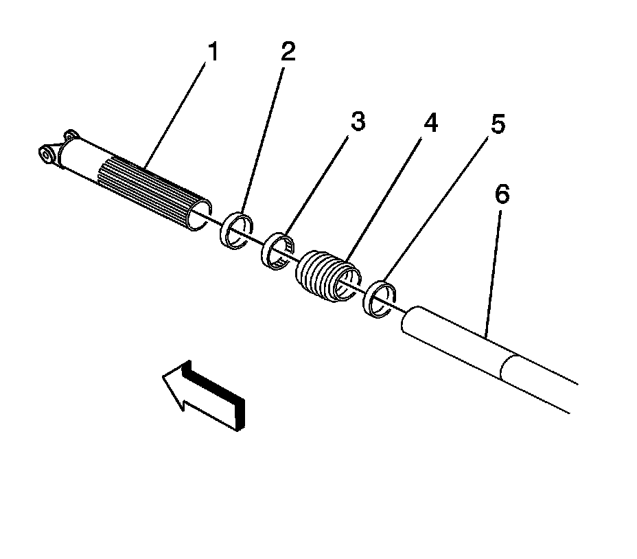 4. Install the bushing (3) on the outer tube (1). The flanged end of the bushing should be toward the rear of the vehicle.