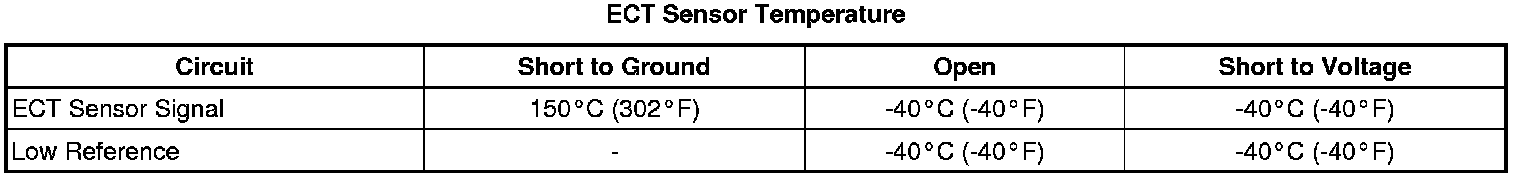 Measure and record the resistance of the ECT sensor at various ambient temperatures, then compare those measurements to the Temperature Versus Resistance (Temperature Versus Resistance).
