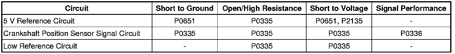 The crankshaft position sensor circuits consist of an engine control module (ECM) supplied 5 V circuit, low reference circuit and an output signal circuit. The crankshaft position sensor is an internally magnetic biased digital output integrated circuit sensing device. The sensor detects magnetic flux changes between the peaks and valleys of a 58-tooth reluctor wheel on the crankshaft. Each tooth on the reluctor wheel is spaced at 60-tooth spacing, with 2 missing teeth for the reference gap. The crankshaft position sensor produces an ON/OFF DC voltage of varying frequency, with 58 output pulses per crankshaft revolution. The frequency of the crankshaft position sensor output depends on the velocity of the crankshaft. The crankshaft position sensor sends a digital signal, which represents an image of the crankshaft reluctor wheel, to the ECM as each tooth on the wheel rotates past the crankshaft position sensor. The ECM uses each crankshaft position signal pulse to determine crankshaft speed and decodes the crankshaft reluctor wheel reference gap to identify crankshaft position. This information is then used to sequence the ignition timing and fuel injection events for the engine. The ECM also uses crankshaft position sensor output information to determine the crankshaft relative position to the camshaft, to detect cylinder misfire, and to control the camshaft position actuator if equipped.