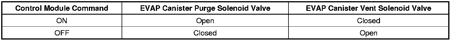 The following table illustrates the relationship between the ON and OFF states, and the Open or Closed states of the EVAP canister purge and vent solenoid valves.