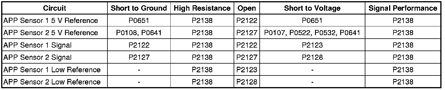 * DTCs P2120, P2122, P2123, P2125, P2127, P2128, and P2138 are Type A DTCs.