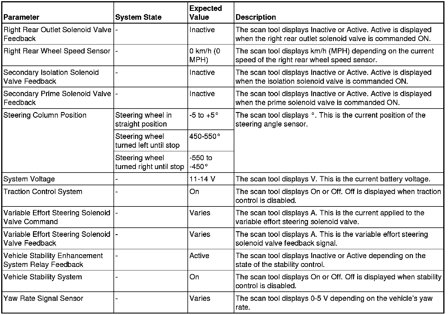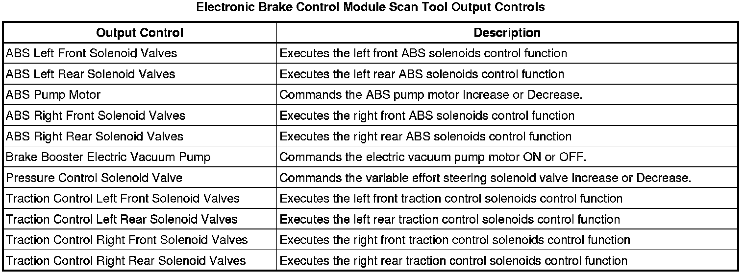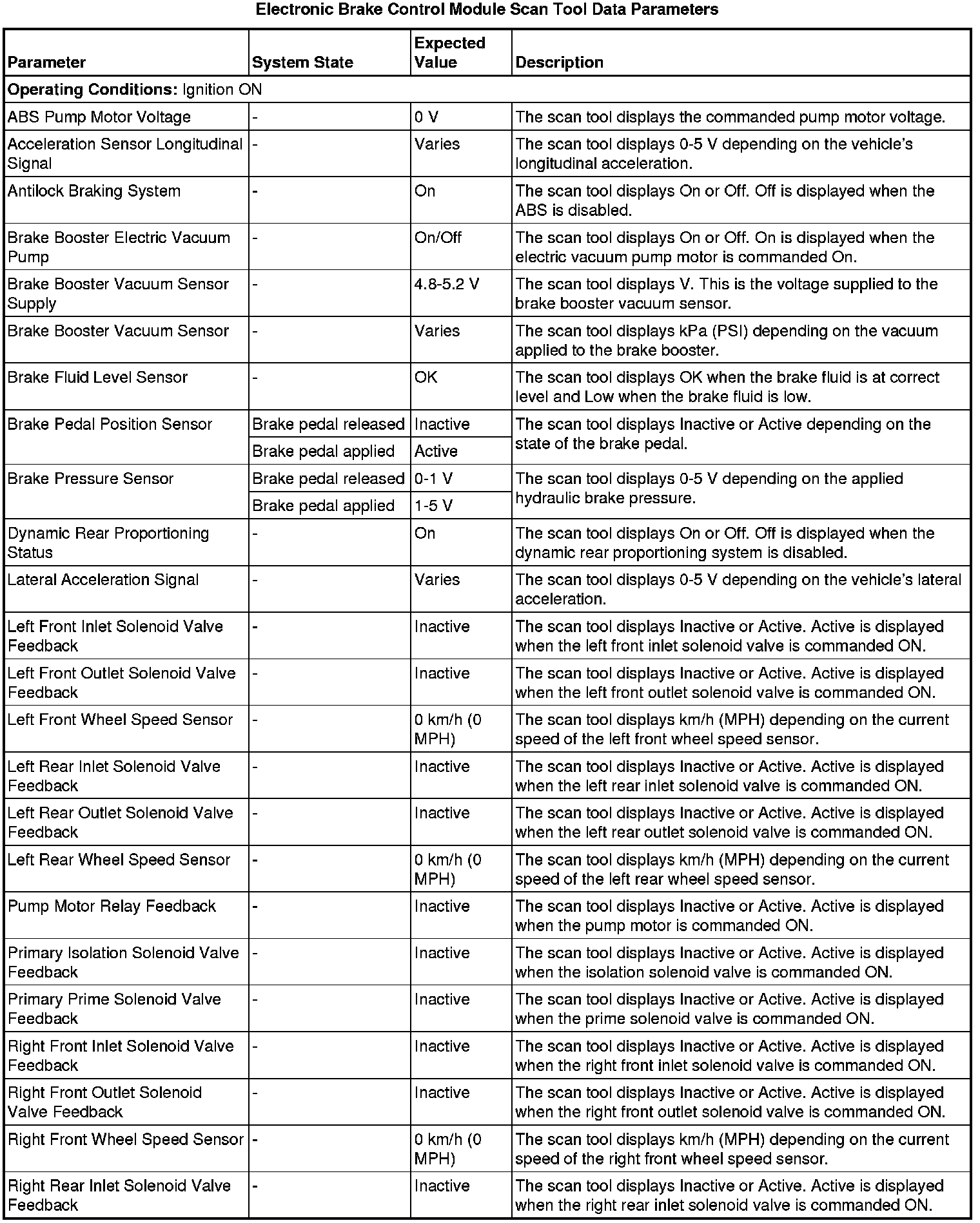 The electronic brake control module (EBCM) scan tool data parameters list contains all ABS related parameters that are available on the scan tool. The list is arranged in alphabetical order. A given parameter may appear in any one of the data lists.