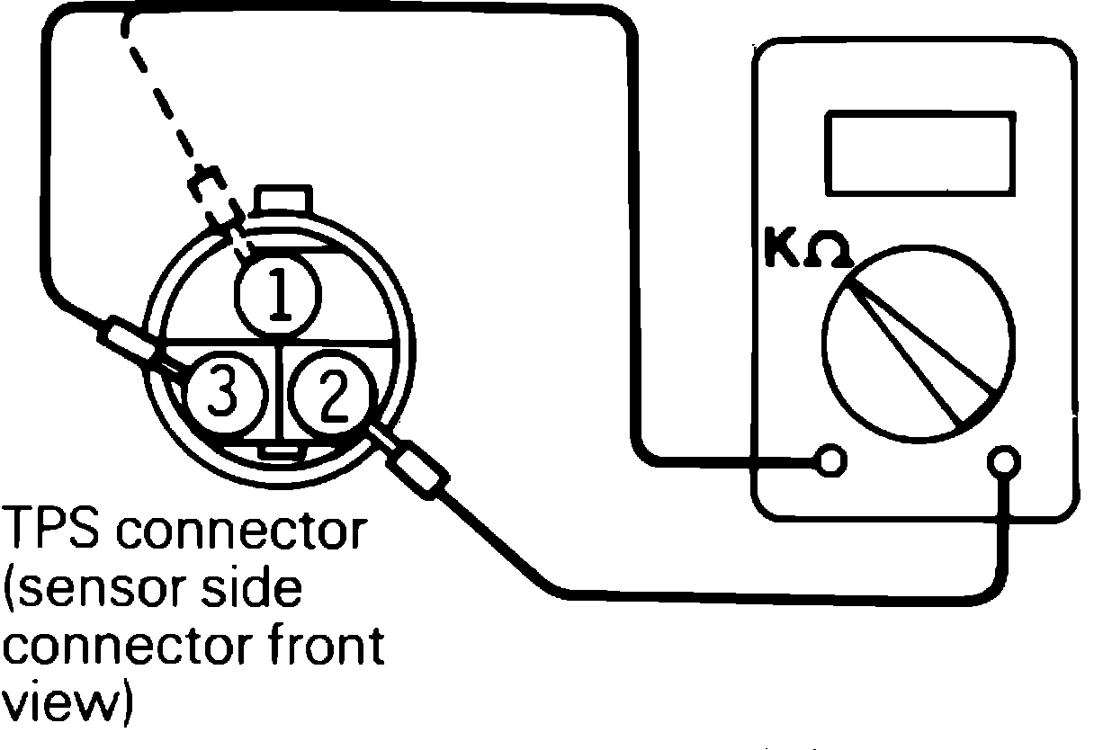 3. Connect a suitable ohmmeter between terminals 1 and 2, then slowly operate throttle valve between idle and wide open throttle. Check that resistance values change in proportion to throttle valve operation. The resistance range should vary between resistance value indicated in step 2 and .5k ohms.