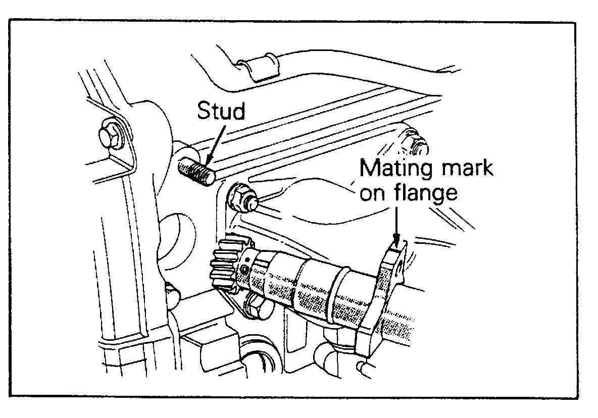 4. Align mating mark on distributor attaching flange with center of distributor flange stud, Fig. 6.