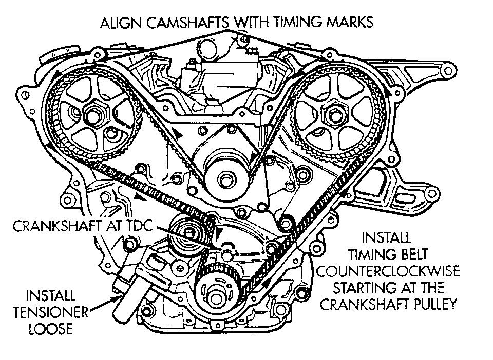 7. Install the timing belt starting at the crankshaft sprocket going in a counterclockwise direction. Install the belt around the last sprocket. Maintain tension on the belt as it is positioned around the tensioner pulley. Each camshaft sprockets mark should still fall between the cover marks.