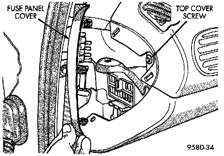 2. Remove fuse panel cover from left end of instrument panel. Remove screw holding end of instrument panel top cover.