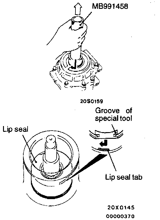 Catch the groove of the special tool on the lip seal tab, and slowly pull the lip seal straight upwards.