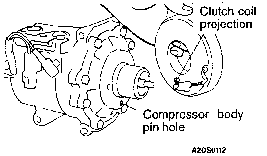 When installing the clutch coil to the A/C compressor body, install so that the pin hole of the A/C compressor body and the clutch coil projection are aligned.