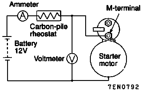 2. Connect a test ammeter (100 Amperes scale) and carbon pile rheostat in series between the battery positive post and starter motor terminal