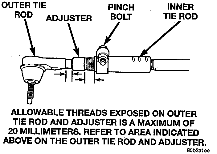 CAUTION: When setting Toe on vehicle, the maximum dimension of exposed threads allowed on inner and outer tie rod can not exceed the distance shown. If the maximum distance is exceeded, inadequate retention of either inner or outer tie rod may result. Ensure that adjustment pinch bolt is torqued to required specification when Toe setting procedure is completed.