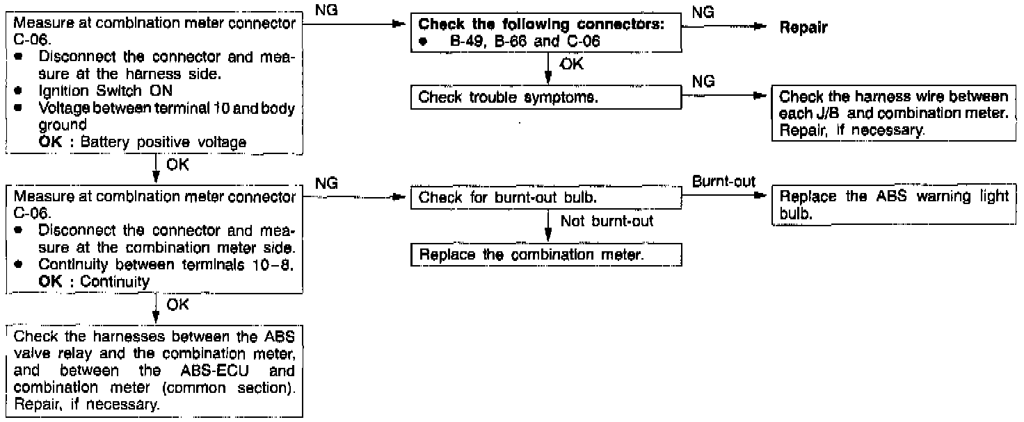 Accordingly, the cause of the light not illuminating is probably an open circuit in the light power circuit, a blown light bulb, or an open circuit in both the circuit between the ABS warning light and the ABS-ECU and the circuit between the ABS warning light and the ABS valve relay.
