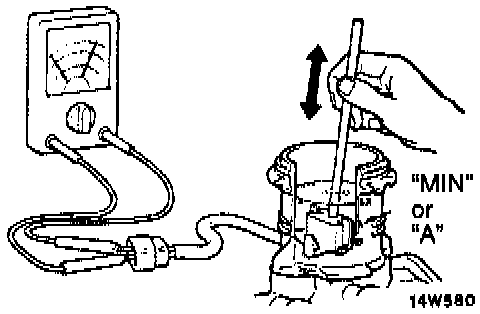 The brake fluid level sensor is in good condition if there is no continuity when the float surface is above "MIN" or"A" and if there is continuity when the float surface is below "MIN" or "A".