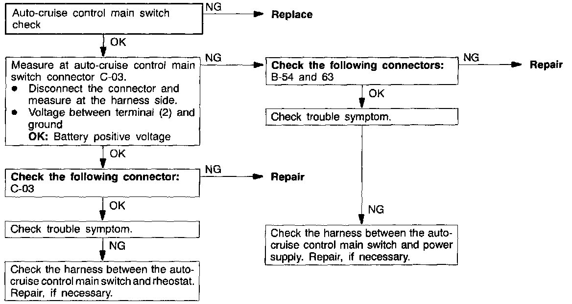 - A malfunction of the auto-cruise control main switch, harness. or connector may exist.