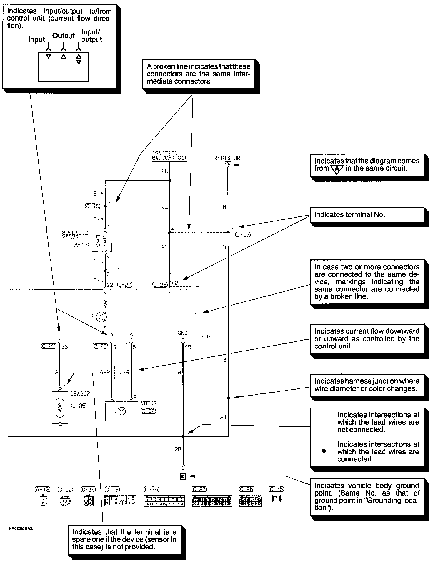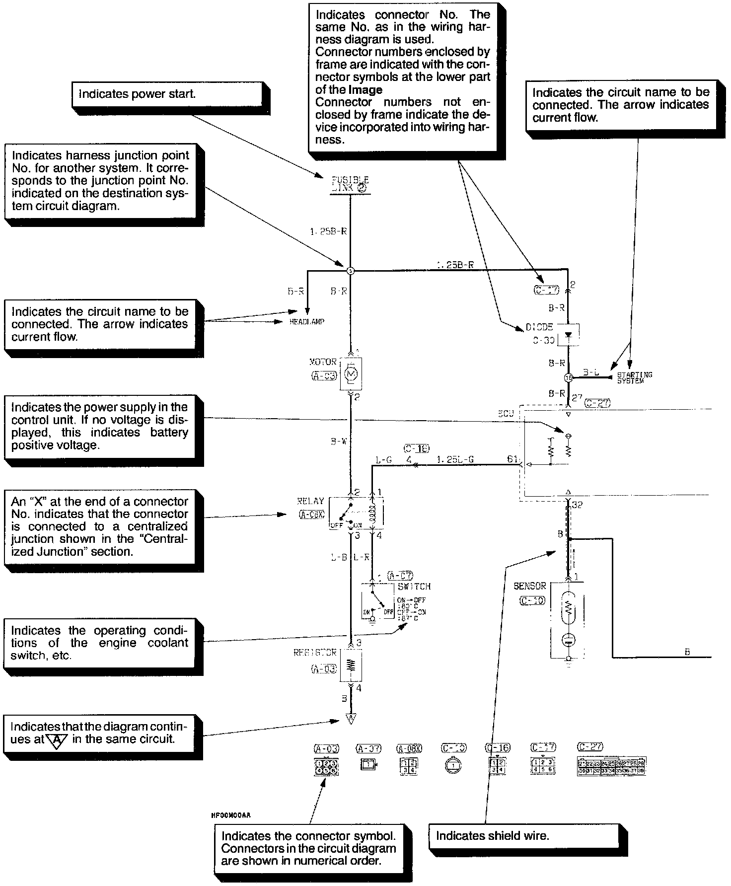 The circuit of each system from the fuse (or fusible link) to ground is shown. The power supply is shown at the top and the ground at the bottom to facilitate understanding of how the current flows.