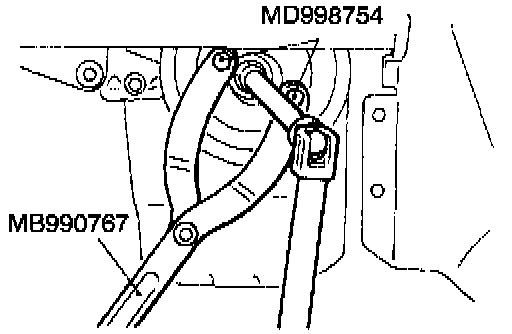 (2) Loosen the center bolt of the tensioner pulley. Use the special tool and a torque wrench to apply tension to the timing belt as shown in the illustration. Then tighten center bolt to the specified torque.