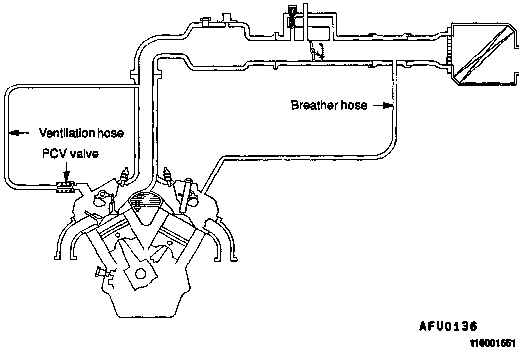 Fresh air is sent from the air cleaner into the crankcase through the breather hose, to be mixed with the blow-by gases inside the crankcase. The blow-by gas inside the crankcase is drawn into the intake manifold through the PCV valve.