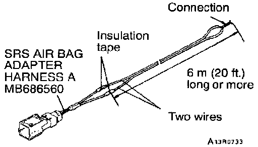 7. Connect two wires, each six meters (20 feet) long or more to the two leads of SRS AIR BAG ADAPTER HARNESS A and cover the connections with insulation tape. The other ends of the two wires should be connected to each other (short-circuited), to prevent sudden unexpected deployment of the air bag.