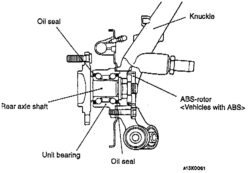 The rear axle consists of a knuckle, rear hub, unit bearing and axle shaft. The unit bearing is press-fitted to the rear axle shaft and bolted to the knuckle. Also, the unit bearing utilizes the same type of double row angular contact ball bearing as does the front axle. In vehicles with ABS, a ABS-rotor for detecting the vehicle speed is located on the rear axle shaft, and a speed sensor is located on the knuckle.
