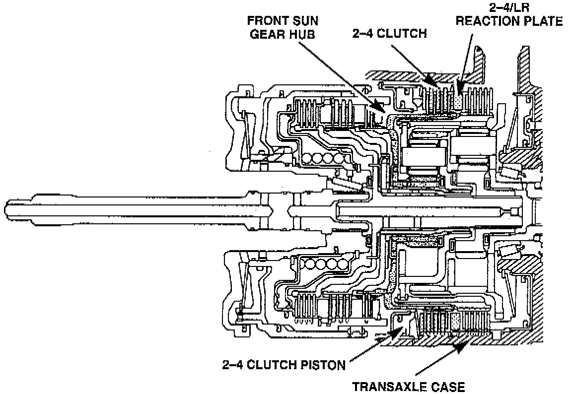Reaction plate The above parts are held in the case with snap rings. The 2-4 clutch surrounds the outside of the front sun gear assembly and when applied hydraulically, locks or grounds the front sun gear assembly to the case. The 2-4 clutch is a holding element. It is a multidisc clutch that provides more room within the transaxle, and eliminates the need for using a band and servo as are used in other transaxle applications.