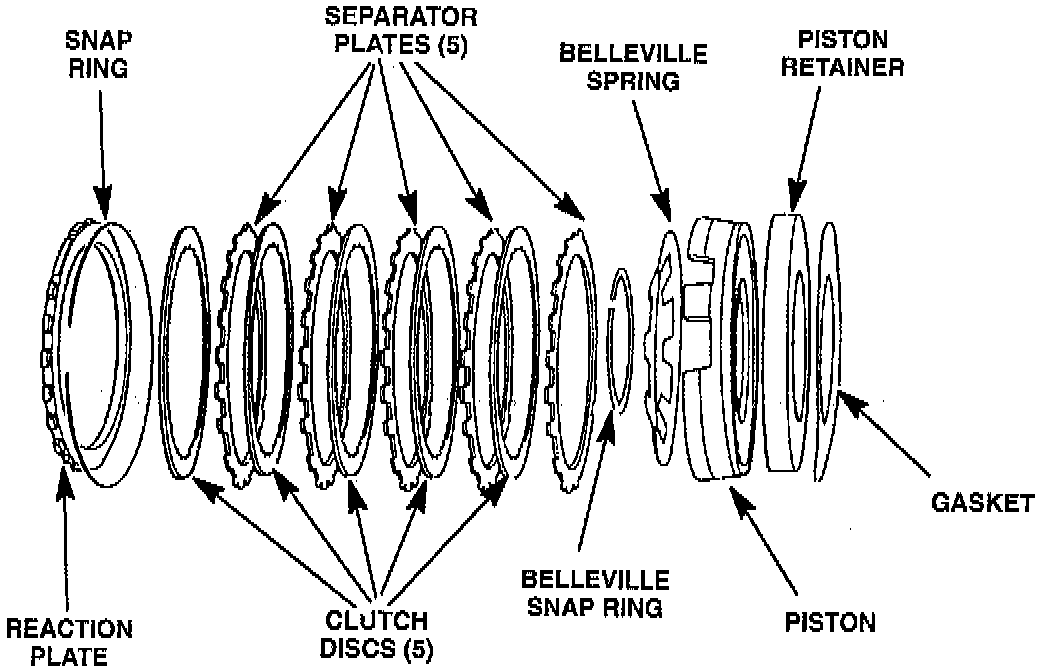 The L/R clutch surrounds the outside of the front carrier assembly, and locks or grounds the front planetary carrier/rear annulus gear assembly to the case when applied. Similar to the 2-4 clutch, the L/R clutch is a holding element and eliminates the need for bands.