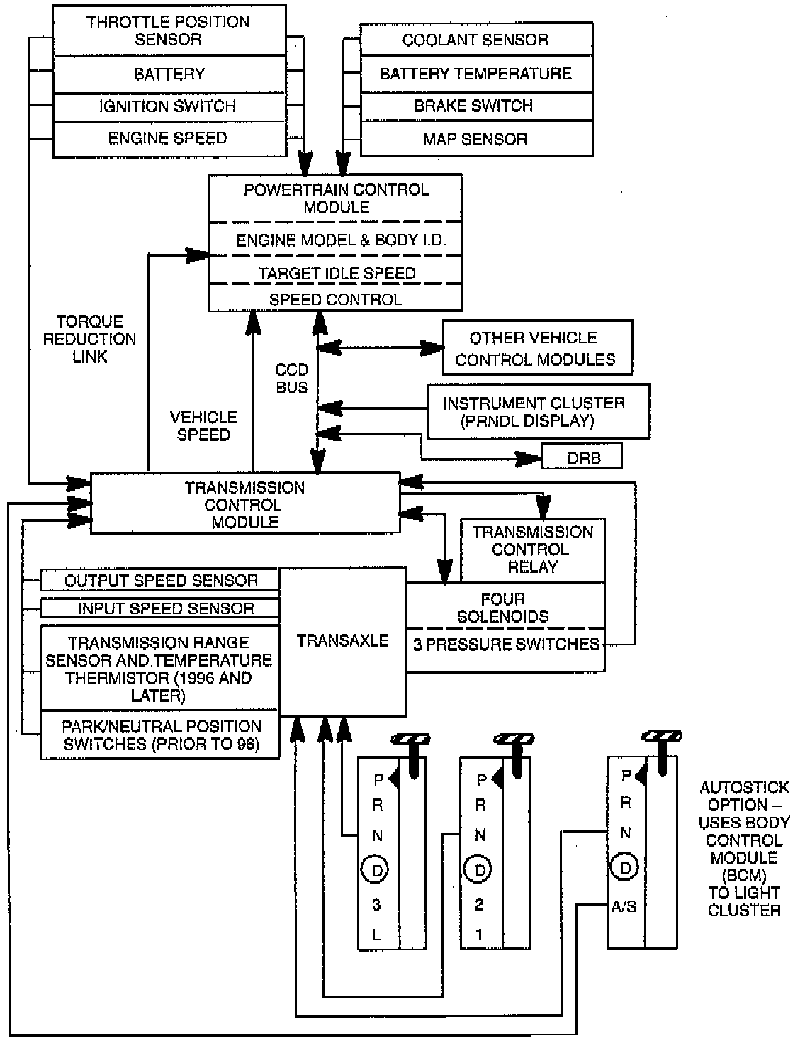The 41TE provides smooth clutch-to-clutch shifts for all gear changes. This is accomplished by reading the input and output speeds over 140 times per second, along with other inputs. This shift strategy is referred to as adaptive control. Adaptive control provides for the precise friction element control needed to make smooth shifts. The TCM learns the release rate of the releasing element and the apply time of the applying element that it is controlling. It also learns the rate at which the apply element builds pressure sufficient to begin making the speed change. It also adapts to any changes that occur with age or environment.