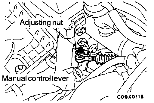 2. Loosen the adjusting nut, gently pull the transaxle control cable in the direction of the arrow and tighten the nut.